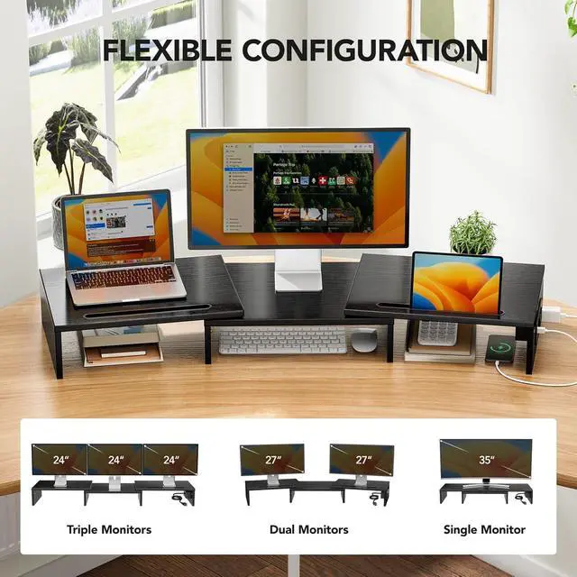 Convenient Charging Hub: This Huanuo dual monitor stand features a built-in 3-in-1 power strip with 2 AC outlets, 2 USB 3.0 ports, and a 59 power cord. Connect your printer, shredder, scanner, headphones, tablets, and other devices all in one place for convenient power and charging.