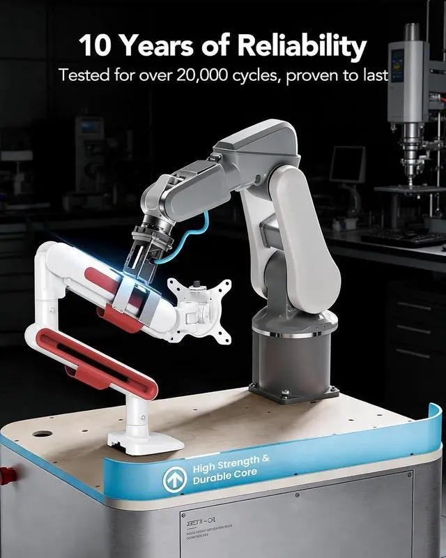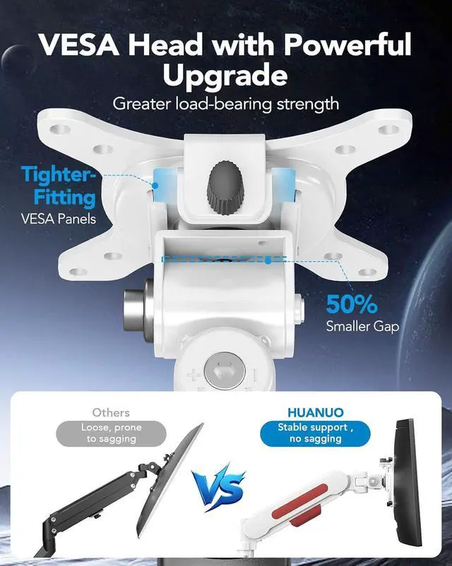 Built for a Decade of Reliable Performance: Powered by HUANUOs upgraded VESA head with a 50% smaller bearing gap and tighter-fitting VESA panels, this heavy duty monitor arm keeps your monitor level and securely in place. Tested for 20,000+ cycles, the high-strength core ensures long-term stability and consistent performance.
