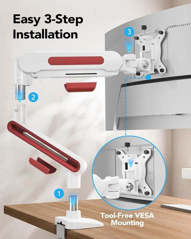Three-Step Setup with Tool-Free Mounting: Install in just three simple steps. This monitor desk mount features an upgraded VESA plate for tool-free attachment, saving time and keeping setup hassle-free. Choose the mounting style that fits your desk: C-clamp for 0.393.15 thick desktops, or grommet base for 0.391.97 thickness.