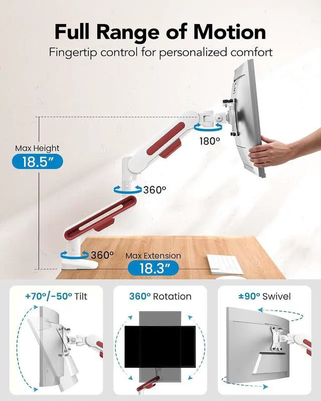 Smooth and Precise Adjustments: Experience super-smooth motion with our NITROGLIDE Technology. This adjustable monitor stand offers height adjustments up to 18.5 and extends up to 18.3, so you can position your screen at the perfect eye level to minimize neck and shoulder strain. With +70°/-50° tilt, ±90° swivel, and 360° rotation, you can easily adjust the monitor to the perfect viewing angle for maximum comfort and ergonomic benefit.