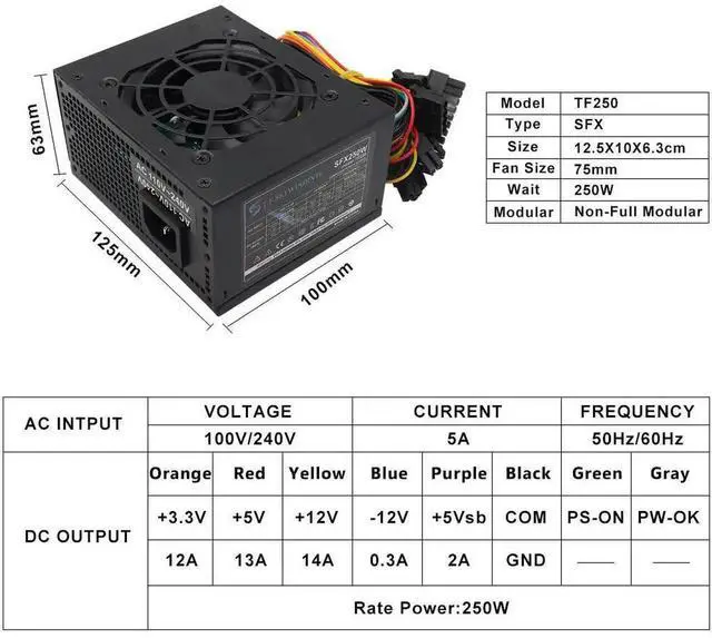 250W Power Supply 50hz/60hz SFX 110V/240V 5A Non-Full Modular Active PFC 75MM Silent Fan High Efficiency Excellent Power Supply