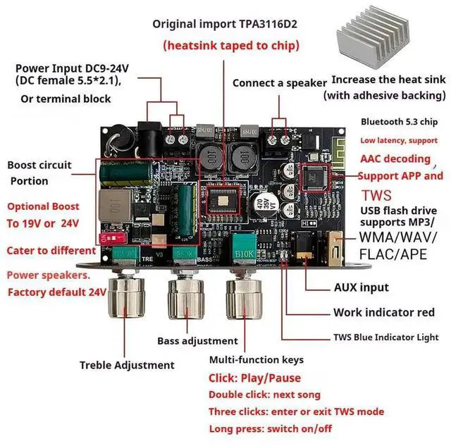 TPA3116 Mono 100W Bluetooth Power Amplifier with Boost Treble and Bass Adjustment Support TWS