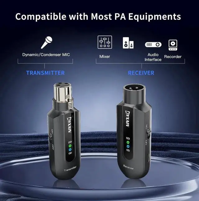 Wireless Microphone Transmitter Receiver 2.4GH z, Wireless Microphone Adapter Rechargeable XLR Transmitter Receiver for Mixer PA Speaker DSLR Camera, 48V Phantom Power for Condenser Mic