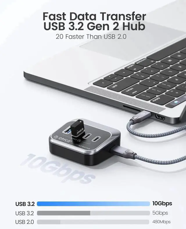 USB3.2 Gen2This hub adopts USB 3.2 Gen 2, the latest USB standard, which offers twice the data transfer rate of conventional USB 3.0 in theory. It supports the latest generation of NVMe SSDs and USB flash drives. This hub expands one of your computers USB ports into 4. The 4 ports share a 10Gbps transfer speed. Please note that this hub does not support charging
