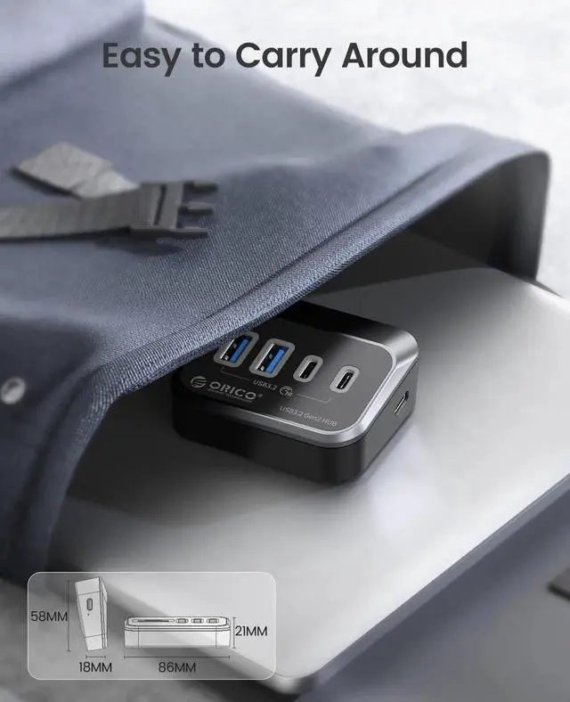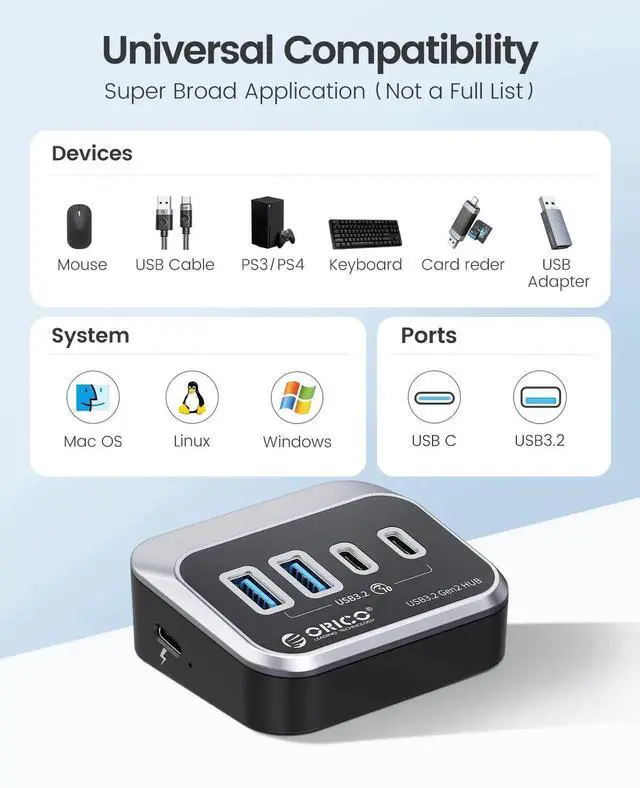Wide CompatibilityThe ORICO USB 3.2 Hub comes with a USB-C to USB-C cable and a USB-A adapter in the package, making it compatible with all USB-A/USB-C laptops (such as the M1 Mac mini, MacBook Air/Pro, iMac, XPS, and Surface Pro) as well as desktop computers. It also works seamlessly with Windows XP/2000/7/8/10/11, Linux, and Mac OS 10.3 or laterErgonomic Design34° Ergonomic Health Tilt Design, which aligns with the human bodys most comfortable posture.