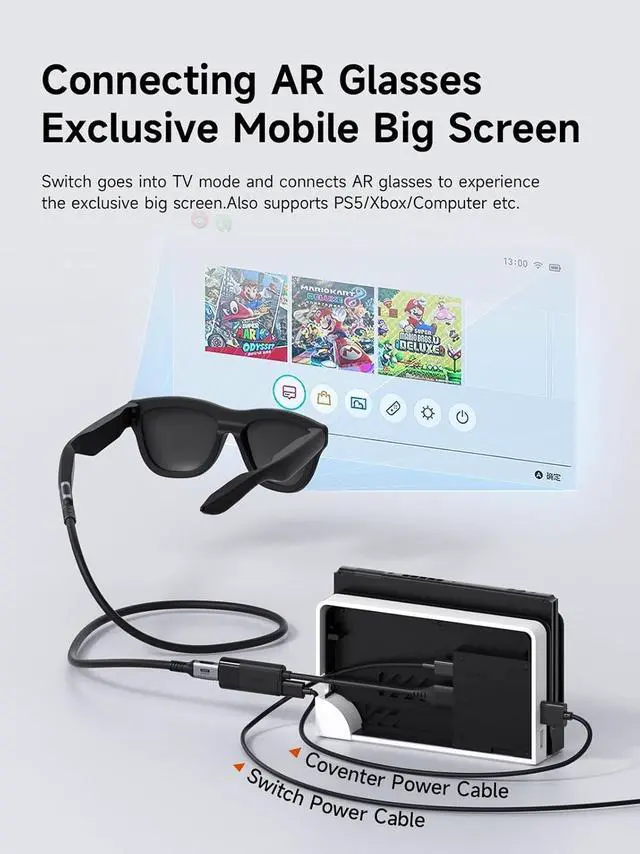 Strong Compatibility: Compatible with all kinds of AR glasses: XREAL Air/2/2 Pro/One/pro/Ultra, Rokid Air/Max, RayNeo Air 2s XR, Viture Pro/One, Thunderbird AR. Compatible with Switch, PS4/5, Steam Deck, ROG Ally. Compatible with Portable Monitor, USB-C projector, Google TV, Fire TV Stick, etc. Compatible with computer hosts, laptops, mobile phones, cameras, monitors, MacBook, iMac, iPad, iOS, Android, Windows, Dell, Asus, HP, Lenovo and more