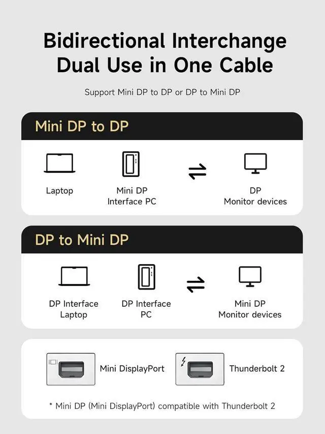 Wide Compatibility: Ideal for Mini DP or Thunderbolt 2.0 : Apple MacBook Air (before 2018), Apple MacBook Pro (before 2016), iMac (before 2017), Microsoft Surface Pro lineup, Surface Laptop, and any other laptops with a Mini DisplayPort or Thunderbolt 2.0 Output, as well as other DisplayPort-equipped (NOT HDMI) desktops/laptops