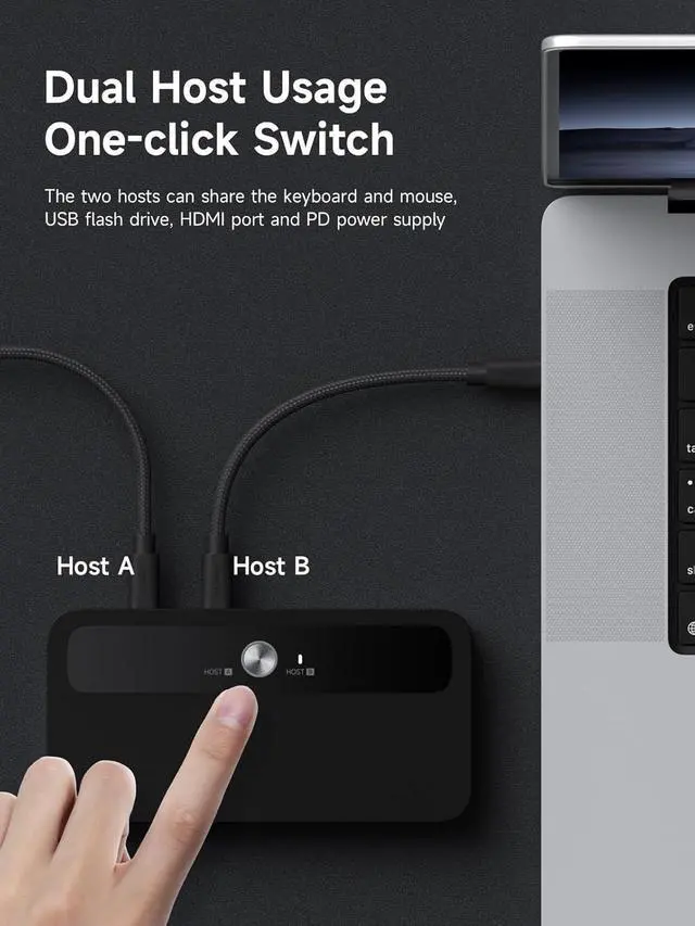Plug & Play: Driver-free operation with automatic adaptation to multi-systems including Windows, macOS, and Linux (e.g., USB sound cards, card readers). Directly compatible via Windows' built-in driver library, avoiding driver compatibility issues caused by system differences. One-key switching for dual hosts enables sharing of keyboard, mouse, USB drives, and video ports between two computers, with 100W PD power supply supported