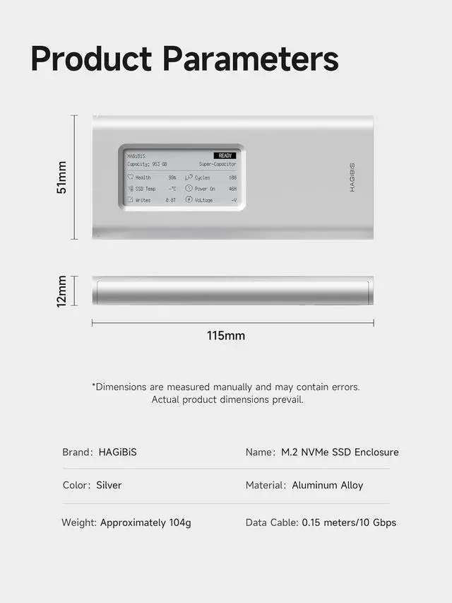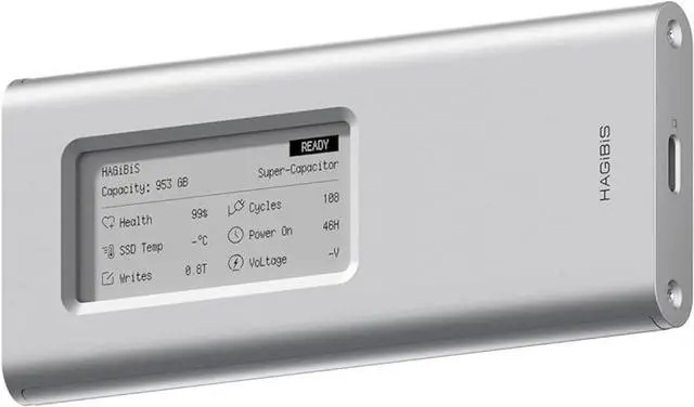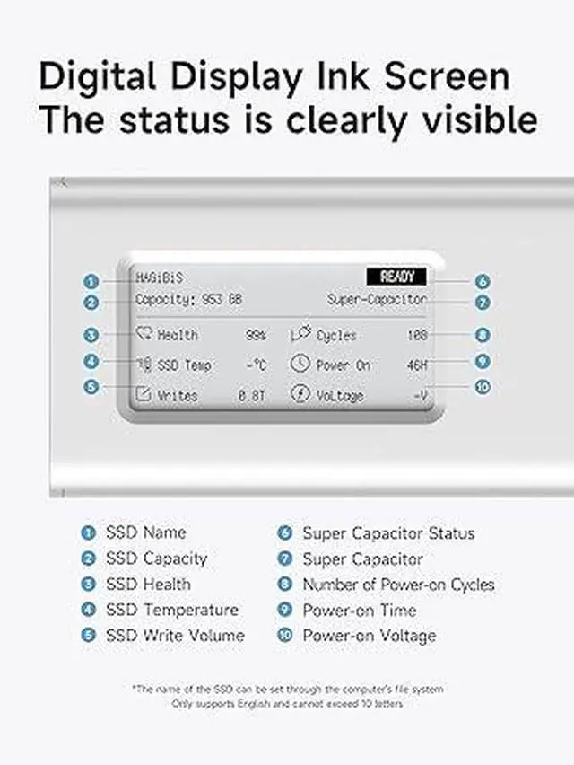 E-Ink Display: Hagibis SSD case has digital display ink screen, real-time display the SSD information such as SSD Name, SSD Capacity, SSD Health, SSD Temperature, SSD Used / Total Memory, Super Capacitor Status, Power-on Cycles, Power-on Time and Power-on Voltage, the status of the SSD is clearly visible. Supports customizing the SSD name, and it can be retained even after power loss. *The name of the SSD can be set through the computer's file system. Only supports English and cannot exceed 10 letters