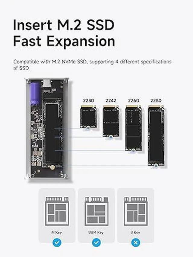 M.2 NVMe SSD: Hagibis M.2 SSD hard drive enclosure is compatible with NVMe protocol (B+M Key/ M Key) SSD hard drives, exclusive to 2230/2242/2260/2280 size solid state hard drive. It supports 10Gbps USB3.2 GEN2 Type-C interface, plug and play, more convenient to use