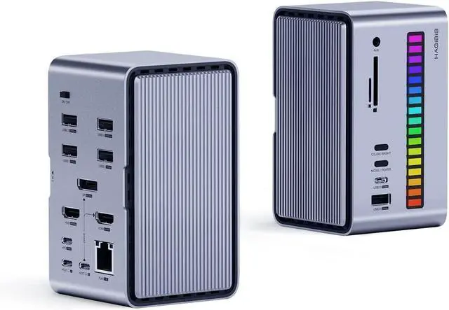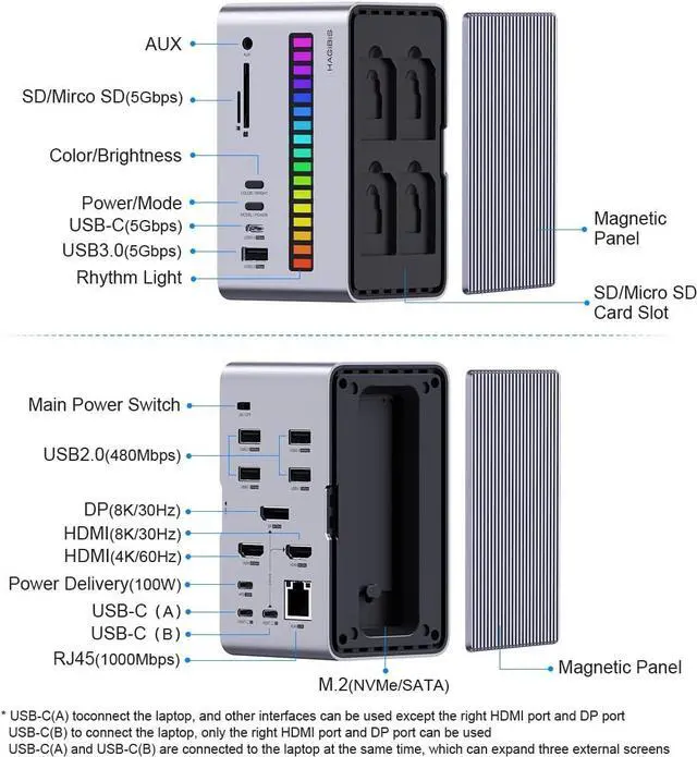 Hagibis Dual USB C Docking Station Triple Monitor, LED Strip Light USB-C Hub Type-C Adapter with 8K DP&HDMI, M.2 SSD Enclosure, 100W PD, USB 3.1, 1000Mbps RJ45 for MacBook Air Pro, Laptop (U100 Ultra)
