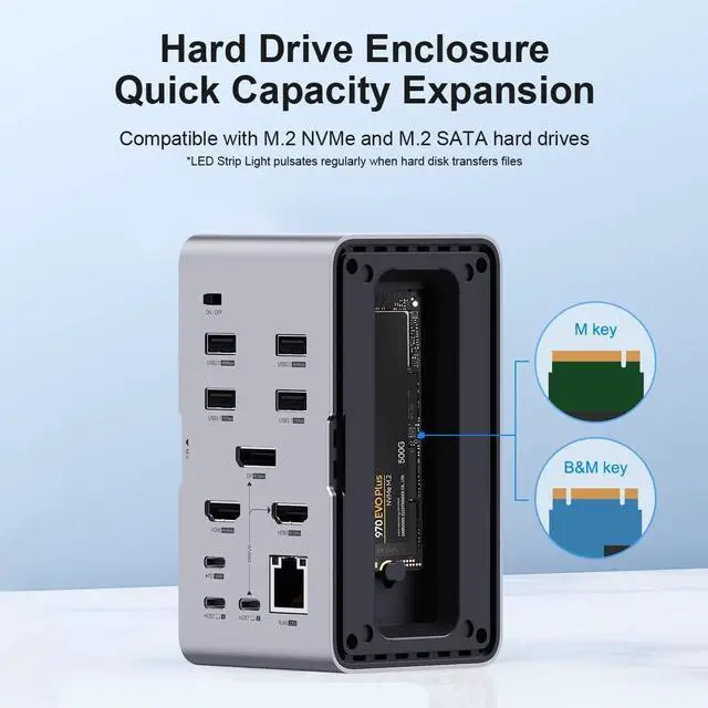 M.2 Hard Drive Enclosure: Compatible with M.2 NVMe and M.2 SATA hard disks, if you use the RGB Memory Mode, the LED strip light will beat when hard disk writes or reads