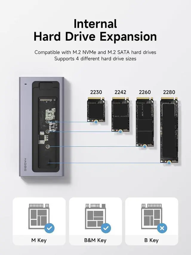 Supports M.2 NVMe and SATA Dual Compatibility: The built-in M.2 card slot interface of the enclosure is compatible with M.2 SSDs using NVMe/SATA protocols and supports sizes 2230, 2242, 2260, and 2280. This means you can easily expand your data storage capacity without the need for additional accessories or adapters