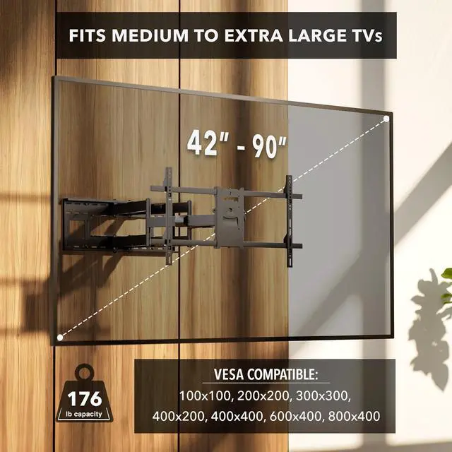 Extra Long Arm TV Mount: Designed to fit most 42"-80" LCD/LED/Plasma TVs on the market. Fits VESA patterns 100x100 up to 800x400mm, and up to 176lbs (Fits 100x100, 200x200, 300x200, 300x300, 400x200, 400x300, 400x400, 600x200, 600x400, 800x400). Please check the VESA (mounting hole pattern behind TV), stud spacing, possible blocked cable/input and your TV weight prior to making purchase decision to determine whether this TV wall mount will fit your TV.