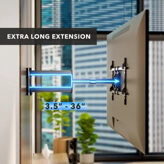 Maximize your TVs positioning and visibility for an all around better viewing experience. The super long 36 dual arm extension allows you to find the perfect angle in any type of space. The wide wall plate can be mounted using 16 or 24 stud spacing.
