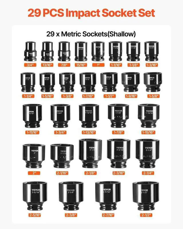 26 Sockets Included: This effort-saving 3/4 inches drive impact socket set comes with 29 shallow impact drive sockets: 3/4'', 13/16'', 7/8'', 15/16'', 1'', 1-1 / 16'', 1-1 / 8'', 1-3 / 16'', 1-1 / 4'', 1-5 / 16'', 1-3 / 8'', 1-7 / 16'', 1-1 / 2'', 1-9 / 16'', 1-5 / 8'', 1-11 / 16'', 1-3 / 4'', 1-13 / 16'', 1-7 / 8'', 1-15 / 16'', 2'', 2-1 / 16'', 2-1 / 8'', 2-3 / 16'', 2-1 / 4'', 2-5 / 16'', 2-3 / 8'', 2-7 / 16'', 2-1 / 2''.