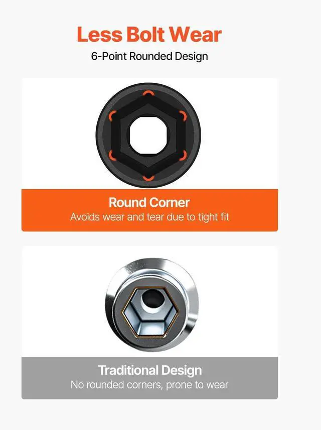 Superior Performance: Whether you drive them with an impact wrench or by hand, these premium chrome vanadium sockets deliver superior performance. The impact socket set features a 6-point, high-torque design that contacts and grips the stronger flat sides of the nut or bolt head, not the weaker corners.