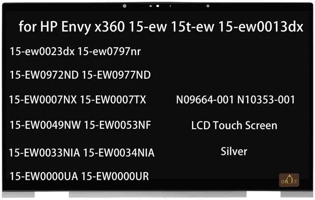 Replacement for HP Envy x360 15-ew 15t-ew 15-ew0013dx 15-ew0023dx 15-ew0797nr 15-EW0972ND 15-EW0977ND 15-EW0007NX 15-EW0007TX 15-EW0049NW 15-EW0053NF 15-EW0033NIA 15-EW0034NIA 15-EW0000UA 15-EW0000UR 15-EW0114NW 15-EW0115NW 15-EW0006NW 15-EW0006NX 15-EW0013NN 15-EW0019NB 15-EW0019NN 15-EW0833NO 15-EW0835NO LCD Touch Screen Assembly Silverpn / N09664-001 N10353-001Purchase GuideBefore purchasing, you need to check the computer model at the bottom of your laptop to see if it is consistent with the title of the link to the purchased product. Avoid losses caused by wrong purchase. If you don't know whether the product you purchased is correct, you can contact our GBOLE customer service. We have someone to contact you and help you purchase the model that matches your machine.