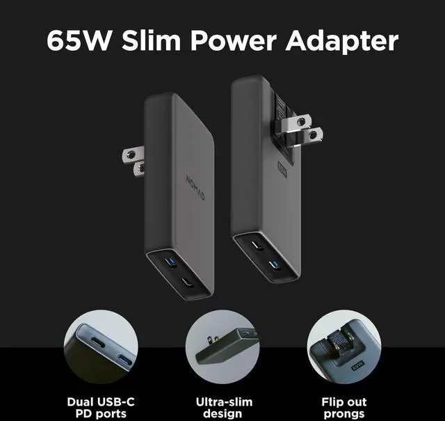 GaN technology: Our Nomad slim charger 65W power adapter effortlessly charges all your devices from the slimmest possible body. It's incredibly slim design fits in even the tightest space and declutters your charging setup at home and on the road. ^^