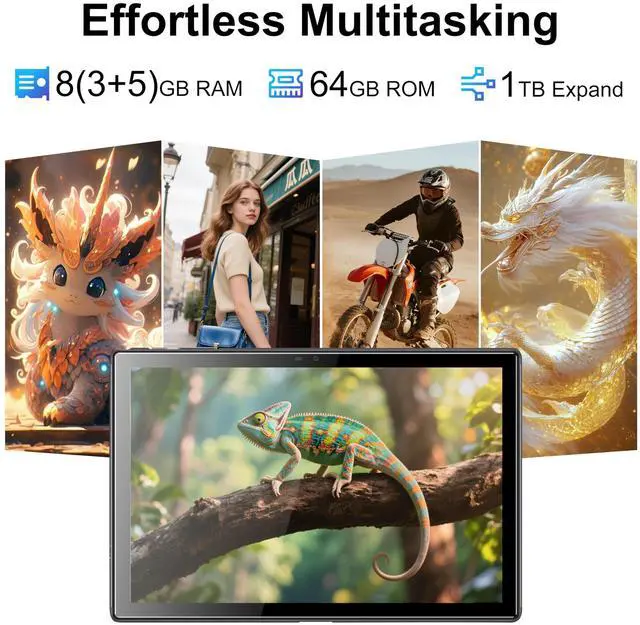 High-Capacity Storage TabletThe 10 inch tablet offers ample storage with 8GB RAM (3GB + 5GB) and 64GB ROM, expandable up to 1TB via SD card (sold separately). Store all your photos, videos, and files with confidence, never worrying about running out of space. Equipped with a 5000mAh battery and low-power CPU, it delivers up to 7 hours of continuous use and 5 days of standby time.
