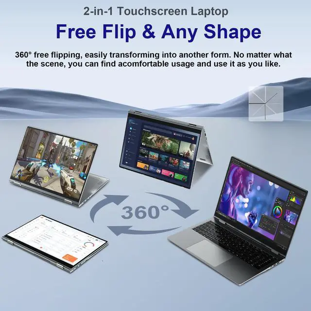 Convertible Laptop: The 2 in1 laptop features a 360 rotating hinge, allowing for four modes of use: laptop, tablet, tent, and stand. The convertible design enhances efficiency and entertainment, making it the ideal companion for both work and play ^^ Flexible