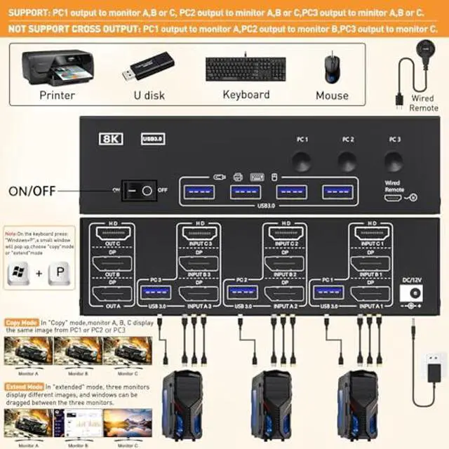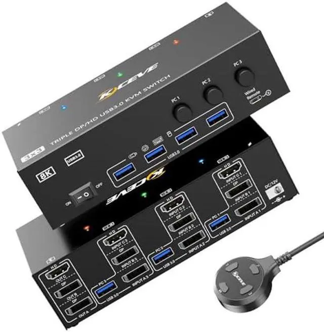 KVM switch 3 computers 3 monitors KVM switch 1 HDMI port + 2 Displayport support 3 PC switching on 3 monitors. HDMI Displayport triple monitors kvm switch output support extended, mirrored and splicing wall display.