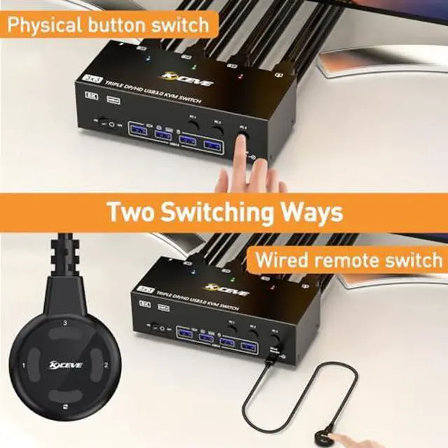 Triple monitors kvm switch support 2 switching modes, you can press the button on the panel or use the wired remote to select the computers. LED light indicates which computer is running.