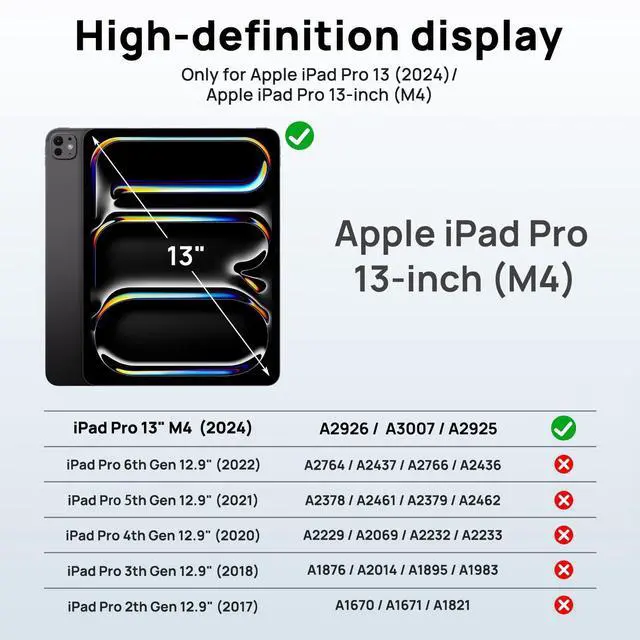 [Model Compatibility]: Designed ONLY for iPad Pro 13 inch M4 2024 Released (iPad Pro 7th Generation ,Models: A2925/A2926/A3007). NOT compatible with other models, Please check your model number before purchasing.