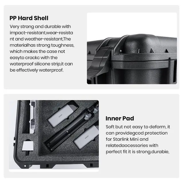 Custom Fit for Starlink Mini KitThis durable starlink mini hard case is designed to perfectly fit your Starlink Mini Dish, power supply, DC power cable, kickstand mount, pipe adapter, tripod mount, battery bank, keeping everything organized and protected ^^ Starlink Travel Case with Tripod MountThis Starlink Mini storage case with tripod mount is an essential companion for secure transport! Built tough with high quality plastic, it ensures protection from impacts and safeguards your equipment wherever your journey takes you ^^ Unique Double Layer A specially designed two-layer provide extra space and better organization for your Starlink Mini and related accessories.