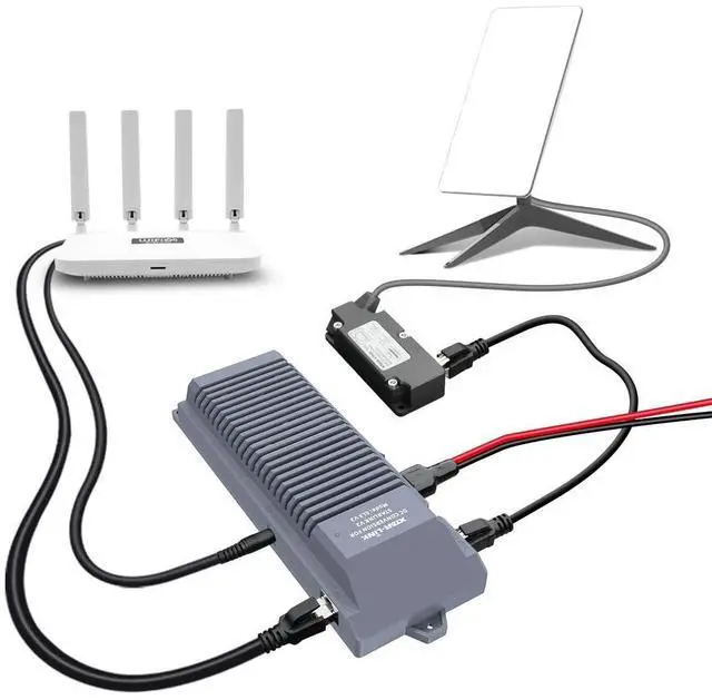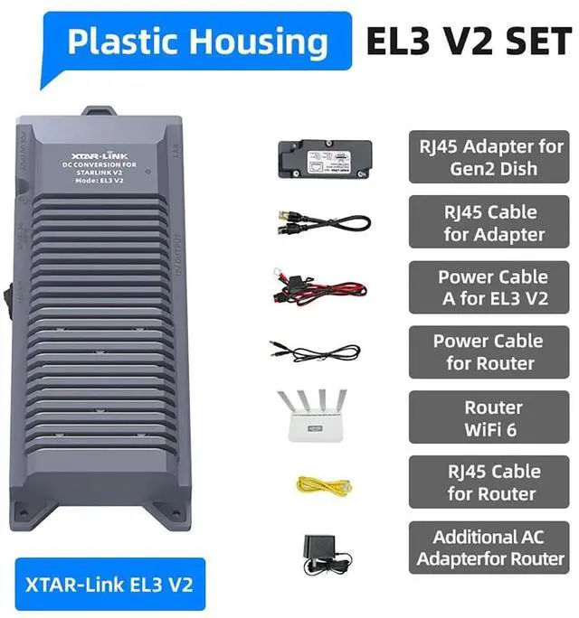 By using a built-in 12V regulator to directly connect to 3rd party router. It significantly reduces the power loss from DC-AC-DC conversion ^^ Versatile Power Compatibility---WIth provided power cable (o-ring to Anderson), you can connect Starlink Dish directly to many 12/24V battery systems, such as those in RVs, boats and off-grid solar setups; You can also connect Starlink Dish to the 12/24V electrical system on any vehicle or Portable Power Stations. XTAR EL3 lets you takes your Starlink wherever your journey takes you. ^^ Full protection---Protected by waterproof, shockproof, and corrosion-resistant metal casing, it also features a power switch, built-in reliable fuses, and a power indicator light to ensure a safe and stable connection to the Starlink network in various environments ^^ Package Include---1x XTAR-Link EL3 V2 1x Power Cable of