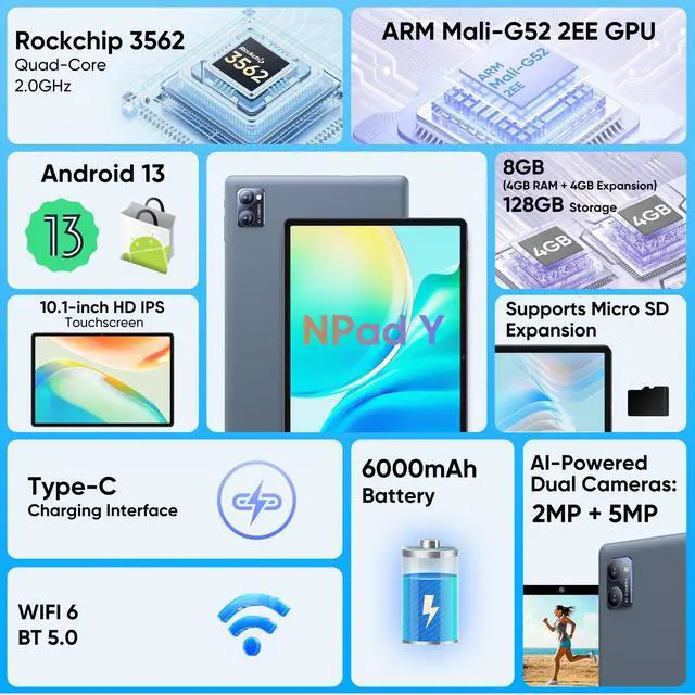 With 8GB (4GB&4GB Expand) of RAM and 128GB of internal storage, youll have plenty of space for apps, documents, photos, and more. The powerful 6000mAh battery supports up to 8 hours of video playback, so you can enjoy uninterrupted entertainment or productivity throughout the day. When its time to recharge, the tablet powers up quickly in just 3.5 hours. Stay connected with dual-band WiFi 6 and Bluetooth 5.0, ensuring fast and reliable internet whether you're at home, in the office, or on the go. The NPad Y also includes a 5MP rear camera, a 2MP front camera, dual speakers, and a built-in microphonemaking it ideal for video calls, online learning, and media consumption.