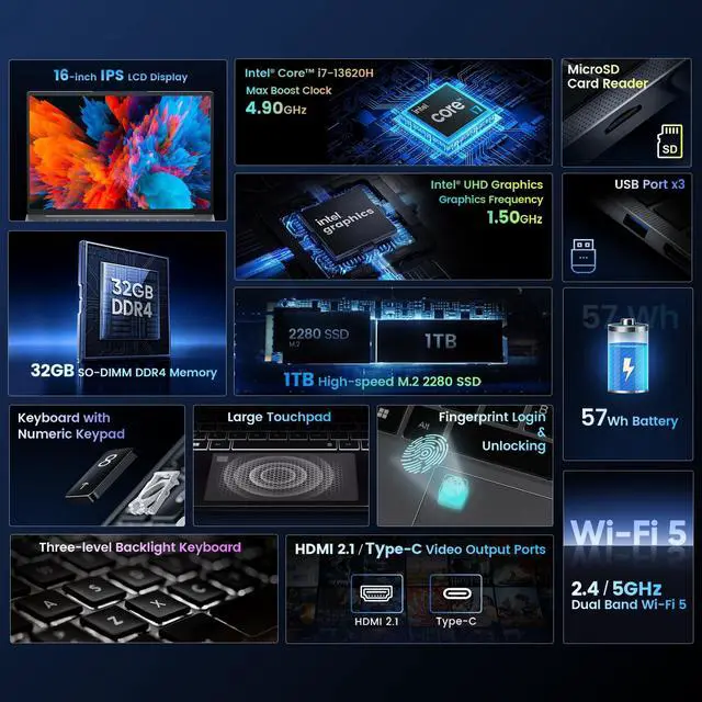 Effortless Speed, Seamless PerformanceN-one Nbook Turbo 16 inch laptop powered by the newest Intel Core i7-13620H 13th Gen processor at 4.9GH z, With its 10 cores and 16 threads, more efficiency and speed 25% than i7-1250U. this 13th Generation Intel Core i7 processor advances real-world computing and delivers more ultra-efficient multi-tasking. ^^ Newest generation of high-performance GPUNewest Gen Intel UHD Graphics for 13th Gen Intel Processors, max Dynamic Frequency 1.5GH z, GPU performance is 57% faster than Iris Xe Graphics eligible. Faster computing speed, smoother video and gaming experience, to meet daily use needs.