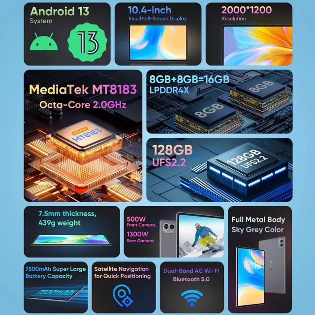 N-one Android Tablet come with the latest and most advanced Android 13 version, is powerd by Octa-Cores, providing a smooth responsive and intuitive user interface, making it easy for kids or adults to navigate and explore on this android tablet. ^^ This Android tablet features a quad-core processor, 8GB RAM and 128GB ROM and expandable storage up to 1TB, ensuring smooth and efficient multitasking for all your needs. Whether you're streaming videos, such as SKYGO, NetFlix, YouTube and more, this tablet delivers outstanding performance. ^^ With a 10.36 inch IPS display and 2000x1200 HD resolution, N-one tablet provides crisp and vibrant visuals.