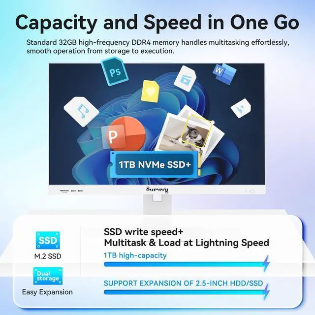 In terms of memory and storage, it has 32GB (16G*2) of high-speed DDR4 RAM (up to 3200MT/s) for seamless multitasking, and a 1TB M. 2 PCIE SSD for fast data access, which is much quicker than traditional hard drives. For connectivity, it supports Wi-Fi 6 ( 802.11 ax) for reliable wireless connections and comes with a variety of ports: 4 USB 2.0, 3 USB 3.0, 1 SD card slot for external storage expansion, 1 HDMI 1.4 b Type A for video output, 1 USB 3.0 Type C for data transmission, 1 3.5 mm Line out (Audio out), 1 3.5 mm Mic in (Audio in), and 1 RJ - 45 (10M/100M/1000M auto - negotiation) for Ethernet connection. The advanced operating system delivers an efficient and user-friendly experience, and this All-in-One desktop computer is suitable for home use, students, professionals, small businesses, school education, and commercial enterprises, with accessories including a wired keyboard & mouse and support for VESA mount and a square base.