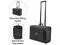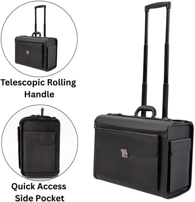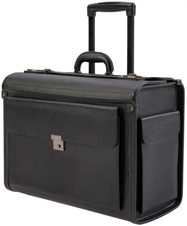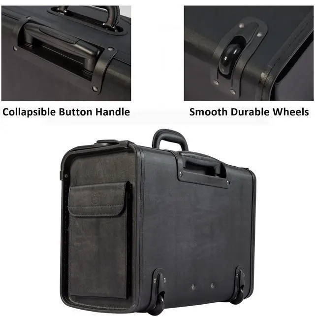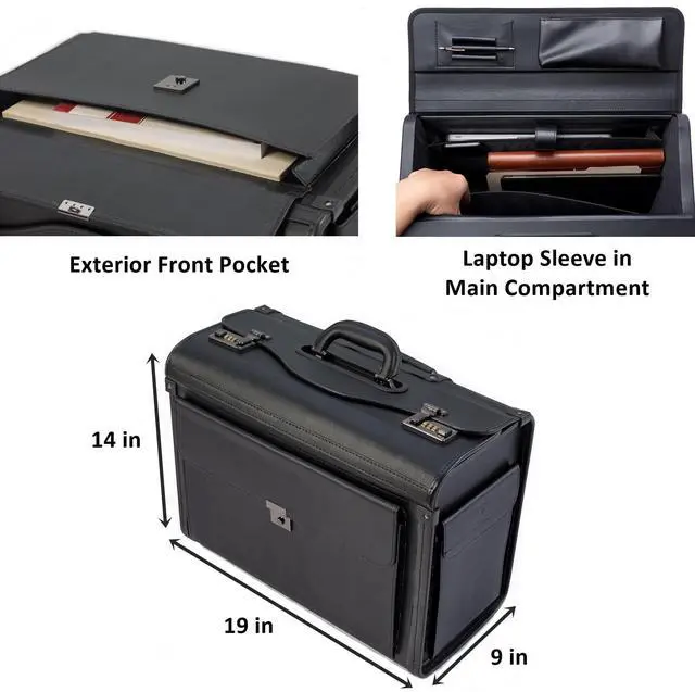 options: Black Leatherette or Black Ballistic Nylon TSA CARRY ON SIZE Measures 19" x 14" x 9" TSA approved carry-on size for all carriers. Interior measurements 17" x 13 1/4" x 7 1/2". Weight Capacity 44 lbs. LAPTOP SLEEVE Main compartment features a divided folder and a padded laptop sleeve with secure elastic strap that fits up to 17 laptop. SPACIOUS & ORGANIZED Main section flap-over comes with organizer that includes a card slot, two pen slots, and a small zipper pocket that measures 8 x 3 x 1.5. Front pocket expands 2 inches and has a button latch. Side pockets each measure 6 x 1 3/8 x 9. Spacious enough for A4 and legal sized documents. SECURE Main section flap closure has secure dual combination locks can be individually set with your desired number combination. DURABLE CONSTRUCTION - Made with a sturdy hard sided frame to last, riveted attachments for all components like the telescopic rolling handle, carrying top handle, and smooth in-line skate wheels. This practical briefcase looks sophisticated and polished. MSRP $ 175.00