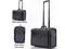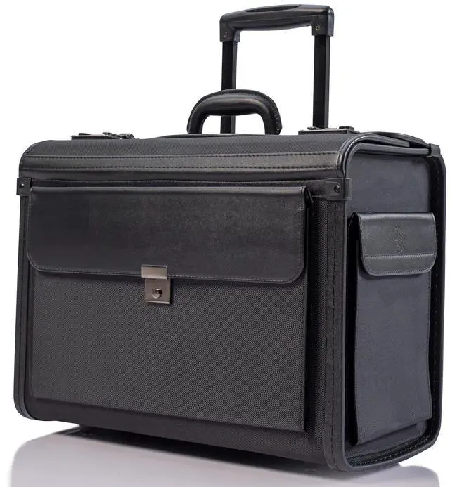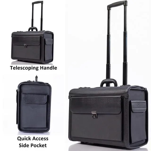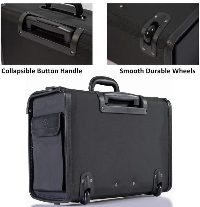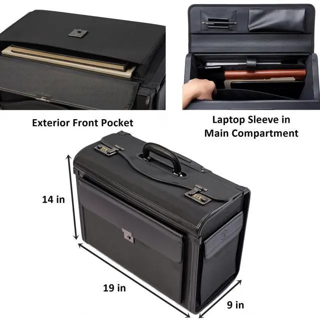 options: Black Leatherette or Black Ballistic Nylon TSA CARRY ON SIZE Measures 19" x 14" x 9" TSA approved carry-on size for all carriers. Interior measurements 17" x 13 1/4" x 7 1/2". Weight Capacity 44 lbs. LAPTOP SLEEVE Main compartment features a divided folder and a padded laptop sleeve with secure elastic strap that fits up to 17 laptop. SPACIOUS & ORGANIZED Main section flap-over comes with organizer that includes a card slot, two pen slots, and a small zipper pocket that measures 8 x 3 x 1.5. Front pocket expands 2 inches and has a button latch. Side pockets each measure 6 x 1 3/8 x 9. Spacious enough for A4 and legal sized documents. SECURE Main section flap closure has secure dual combination locks can be individually set with your desired number combination. DURABLE CONSTRUCTION - Made with a sturdy hard sided frame to last, riveted attachments for all components like the telescopic rolling handle, carrying top handle, and smooth in-line skate wheels. This practical briefcase looks sophisticated and polished. MSRP $ 175.00