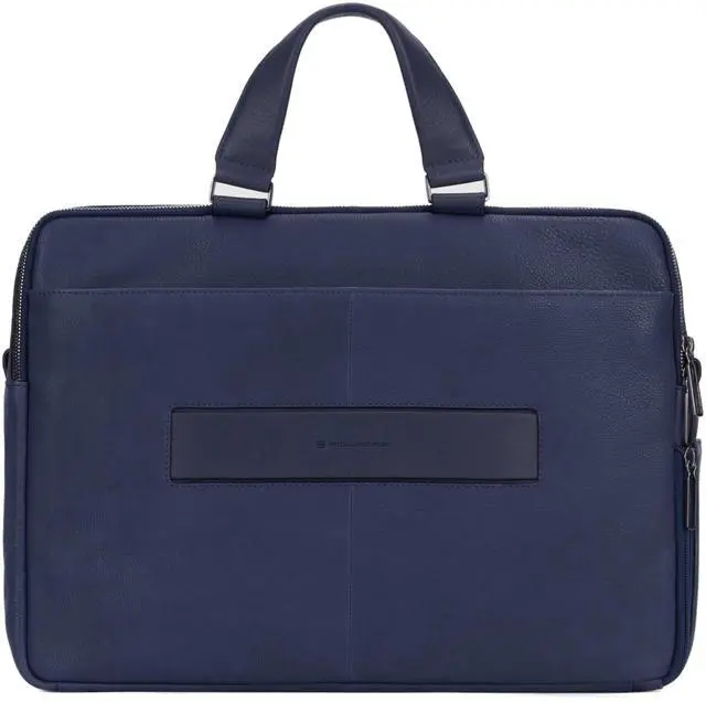 Piquadro work bag in sturdy leather with a modern and linear design. The bag features two spacious main compartments with padded laptop and tablet compartment and numerous side compartments for valuables, documents, cell phone, pens and more, plus several other front pockets for better organization. A support allows it to be attached to the extractable handle of a trolley. The practical yet elegant companion for everyday work or business trips.
