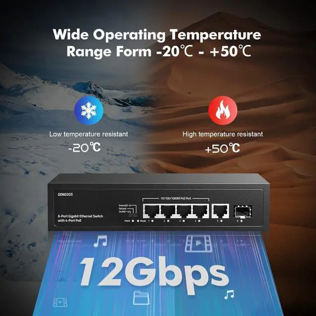 Gigabit Ports: Includes 4 POE, 1 Uplink and 1 SFP Port, all ports support gigabit rate (1000Mbps); switching capacity is 12Gbps, supports full line rate forwarding of all ports. SFP Slot supports single-mode and multi-mode optical module, which can transmit longer distances through optical fibers