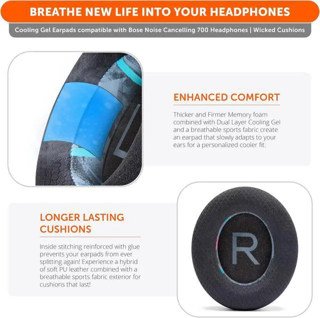 WC FreeZe NC700 - Cooling Gel Ear Pads for Bose Noise Canceling 700 Headphones ^^ Breathable Sports Fabric, Cooling Gel, Extra Thick & Cooler for Longer ^^ 90's Black