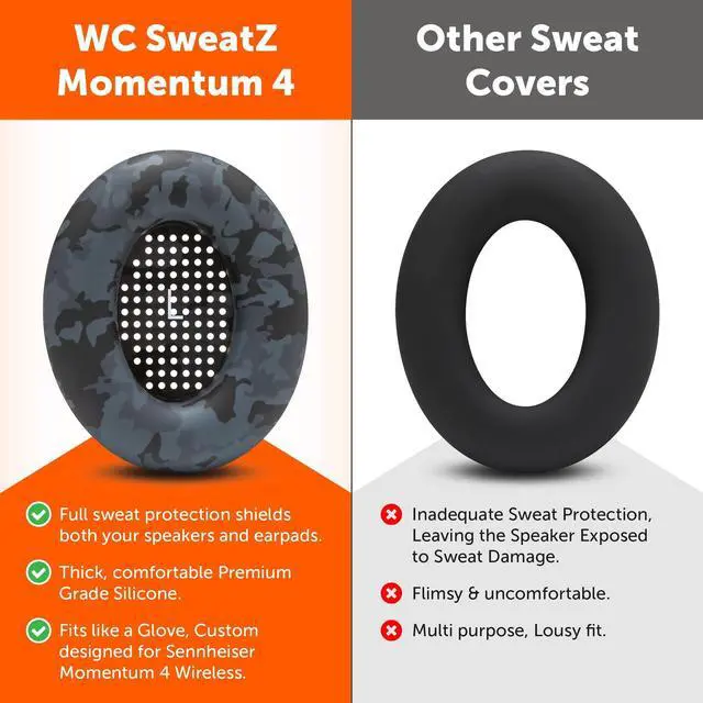 ^^ Ultimate Defense: Unlike other sweat covers, WC SweatZ Momentum 4 protect the entire earpad including the inside drivers. WC SweatZ Momentum 4 silicone covers slide on and off your existing Sennheiser Momentum 4 headphone ear pads in seconds, keeping them fresh and protected from sweat, moisture, and everyday wear.