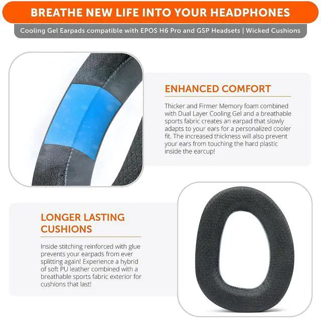FreeZe: Upgrade your audio sessions with WC FreeZe cooling gel ear pads designed for EPOS H6 Pro Headsets. Dual Layer cooling gel (interior layer, top layer) combined with a breathable hybrid of sports fabric and leather ensure lasting coolness and comfort.