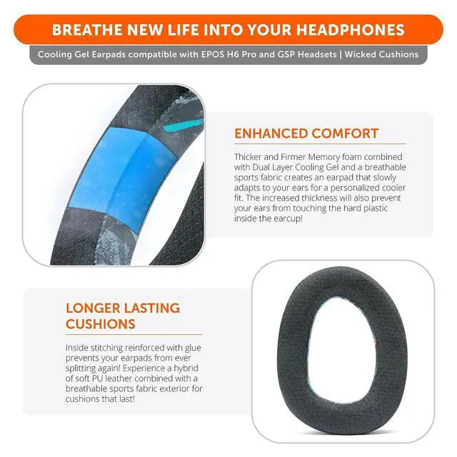 FreeZe: Upgrade your audio sessions with WC FreeZe cooling gel ear pads designed for EPOS H6 Pro Headsets. Dual Layer cooling gel (interior layer, top layer) combined with a breathable hybrid of sports fabric and leather ensure lasting coolness and comfort.