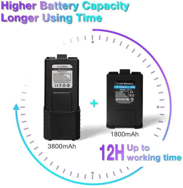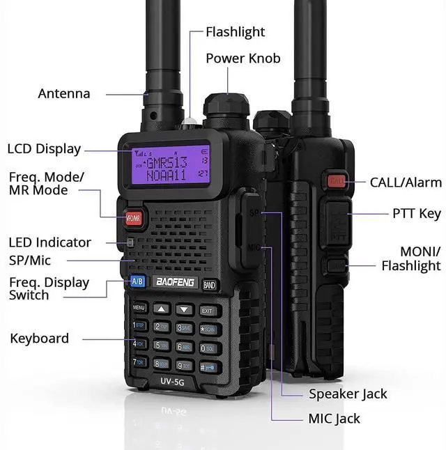 FCC ID: 2AN62-UV5G. A GMRS license is required. UV-5G is the GMRS version of the classic UV model. ^^ [Lasting Service Life] The radio set comes with 2 BL-5L 3800 mAh batteries and 2 regular 1800 mAh batteries. You can switch batteries with confidence to maintain long-lasting use. The rechargeable two way radio would work well with your other GMRS units. You can share the whole set with your family and friends when you are hiking or camping. ^^ [Longer Talking Range] UV-5G is a repeater capable long range radio and has the 8 repeater pairs programmed in from Channel 23-30. GMRS power levels and wide-band capable signal will allow a further talking range. When used with a GMRS Repeater, the range of the two way radio will be greatly extended. ^^ [NOAA Scan & Receiver] Always one step ahead of the terrible weather. the NOAA feature automatically scans and receives weather reports from the channel, letting you know when bad weather is coming. An alternative communication option in case of disaster when cell towers are always overloaded. Use it as your emergency radio! ^^ [Simple Operation] Easy to read with LCD tri-color display.