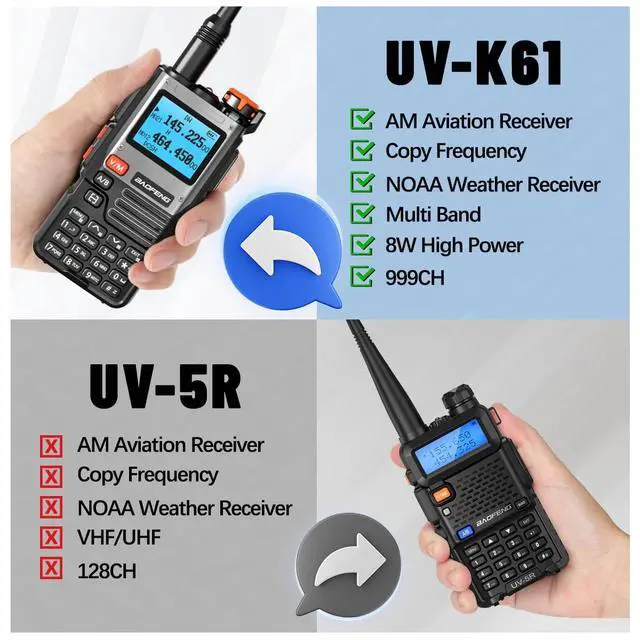 Support Chirp (Compatible programming software: K6). The UV-K61 is a multi-band handheld radio that supports UHF, VHF, AM and other frequency bands. It has various functions including frequency copy, dual-frequency standby, VOX, DTMF, flashlight, etc. It can store 999 channels and also supports NOAA weather alerts and stopwatch functions. ^^