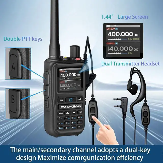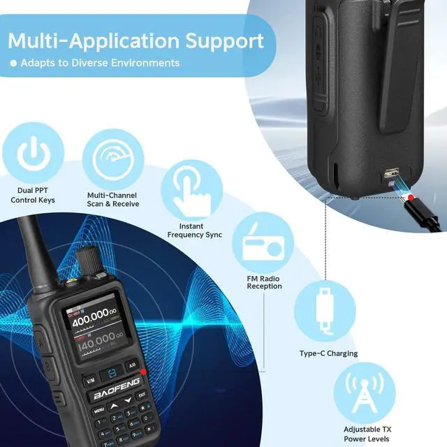 The Baofeng UV5R Mini automatically scans and alerts you to severe weather updates, helping you stay safe during storms, disasters, or wilderness trips. ^^ Type-C Fast Charging & Long Battery Endurance Equipped with a Type-C charging port, the Baofeng UV-5G Mini GMRS and UV-5R series radios charge quickly and conveniently from power banks, car adapters, or laptops. Enjoy extended talk time and standby for longer outdoor adventures. ^^ Complete Outdoor Kit Mic & Dual PTT Earpiece This Baofeng UV-5R Mini Radio comes with a mini mic and dual PTT earpiece for hands-free operation.