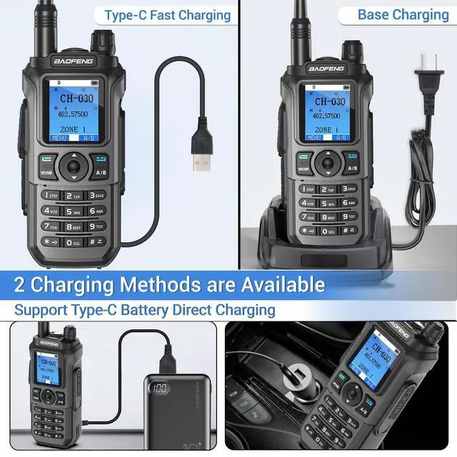 ^^ USB-C +Desktop Charger: The Type-C charging port is designed on the back of the battery. Two charging methods making convenient for you to charge anytime and anywhere. When you go out, you can charge your walkie talkie on the car, power bank, laptop, wall or any USB interface device, no longer worrying about battery life issues.