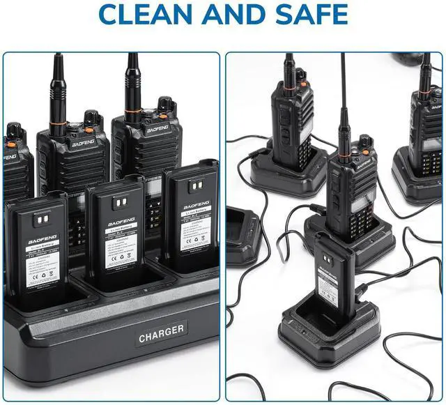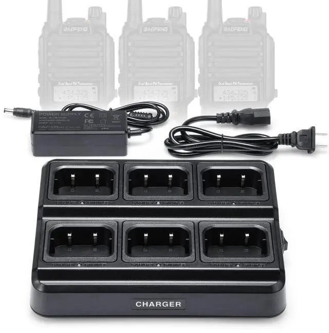 Charging current: 500mA (per pocket). DC 8.4V, 100-240V. We insist on using safe and reliable materials to provide multiple protection for charging. No worry about overcharging, overvoltage, and short circuits. Radio charging in normal scenarios is safe. ^^ [Compatible Models] The six-way desktop charger will work well for Baofeng two way radios such as UV-9G, GT-3WP, UV-9R, and UV-9R PLUS. Charge 6 radios or batteries at the same time. Full charge for