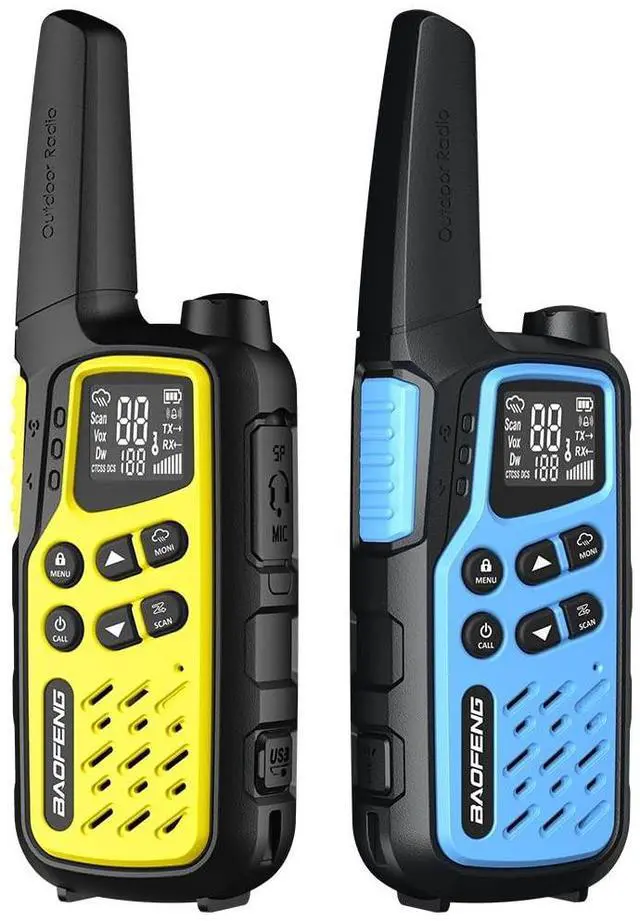 Package Includes: Yellow walkie talkie x1, blue walkie talkie x1, li-ion battery x2, earphone x2, dual socket charger head x1, type-c charging cable x2, belt clip x2, lanyard x2, manual x1.