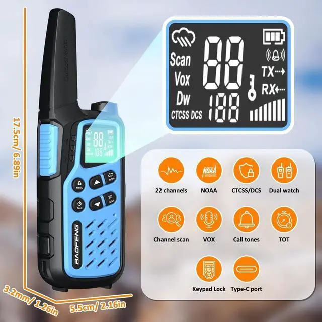 Use: The long range walkie talkie is lightweight and easy to carry, it is designed with a clear screen and simple buttons for viewing and operating. Besides, the 2 way radio has the VOX function to enable hands-free communication, along with the keyboard lock to avoid accidental touch, and its volume can be adjusted according to your needs. It's an ideal walkie talkie for adults children ^^ 1400mAh