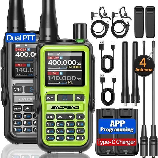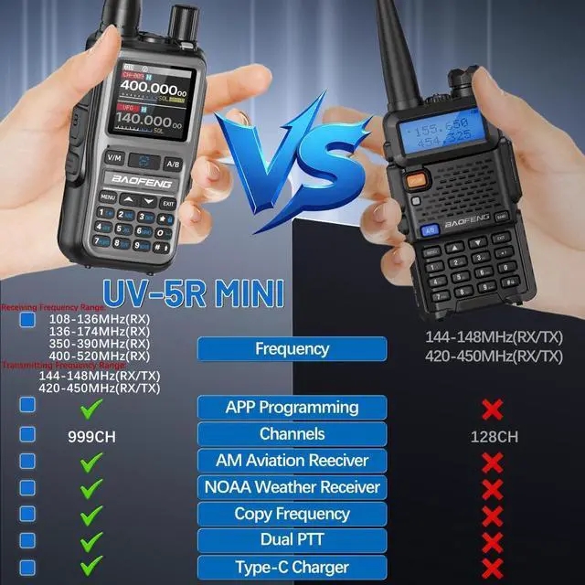 Frequency Range: 108-136MHz, 136-174MHz, 350-390MHz, 400-520MHz. Multi-functional mini ham radio equipped with multi band, Copy frequency, Airband receive, Type-C Charger, 999 channels, Voice Activation (VOX), Flashlight, Large LCD, Keyboard Lock, Volume Adjustment, Channel Scan, CTCSS and DCS Encryption.